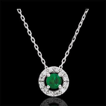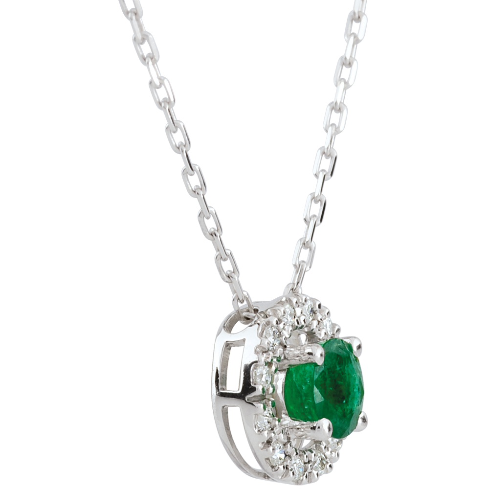 Un cerchio in Oro bianco e diamanti custodisce un prezioso smeraldo.