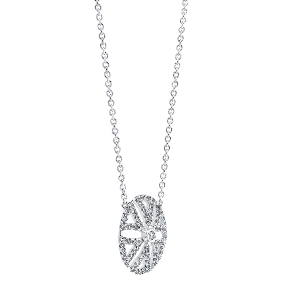 Un motivo floreale rivisitato in una forma grafica contemporanea per questo pendente traforato, dai contorni pavé. Un modello originale e raffinato. Con catenina regolabile a 42cm e 45cm.