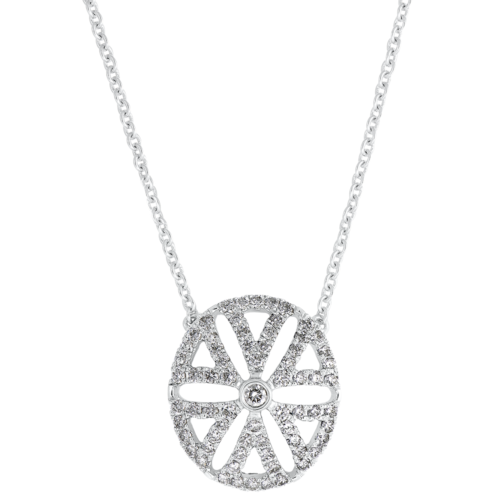 Un motivo floreale rivisitato in una forma grafica contemporanea per questo pendente traforato, dai contorni pavé. Un modello originale e raffinato. Con catenina regolabile a 42cm e 45cm.