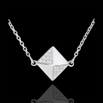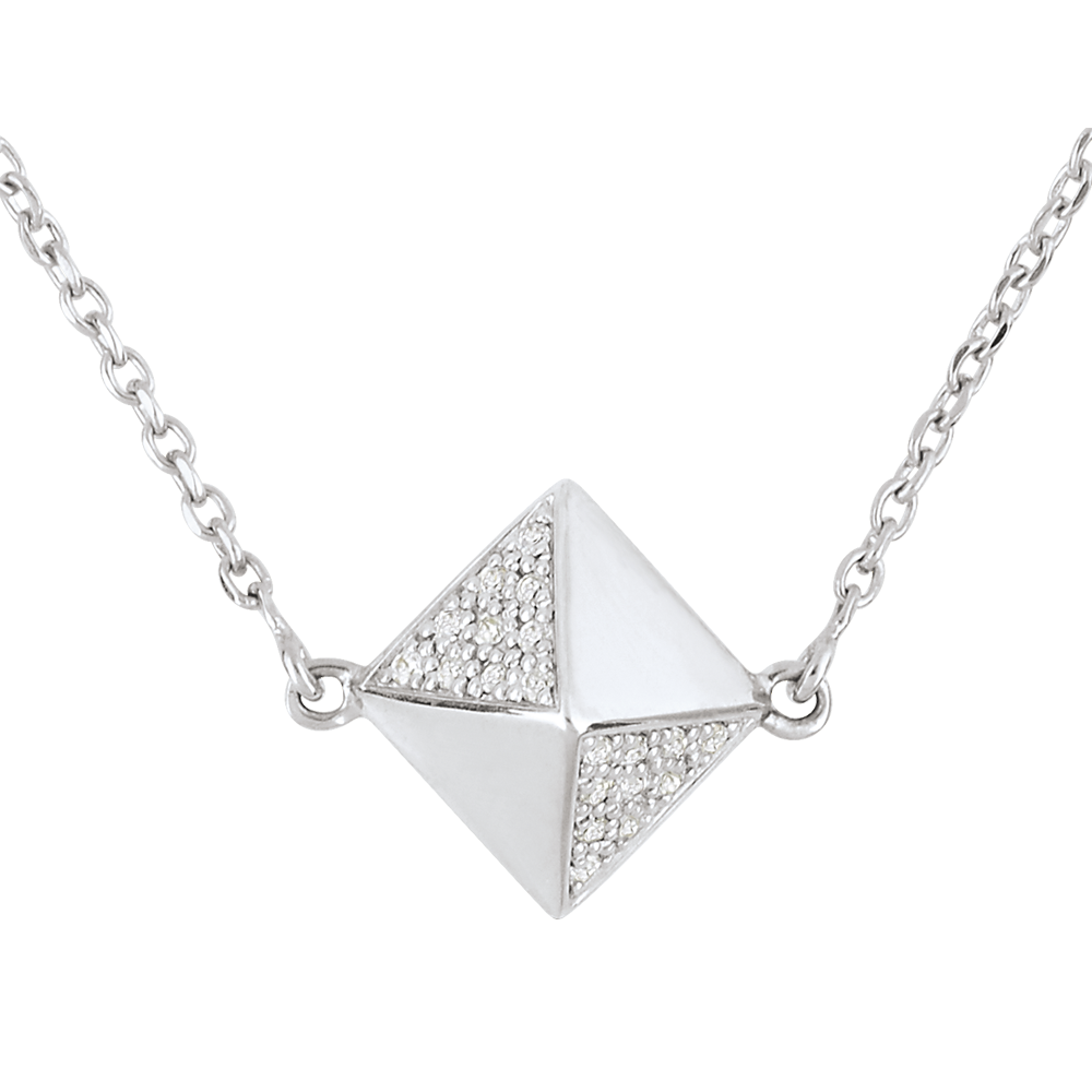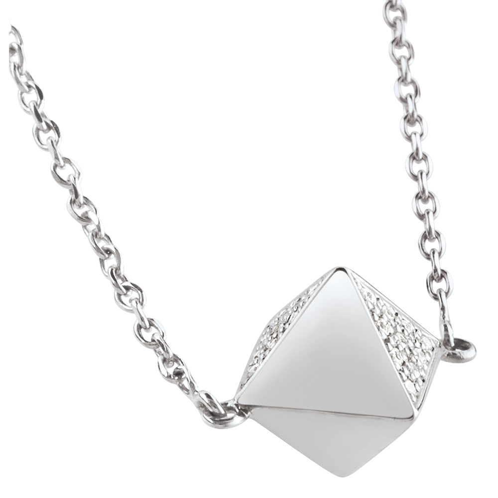 Una collana che omaggia la forma a ottaedro originaria del diamante grezzo, declinandola in Oro e pavé di diamanti.