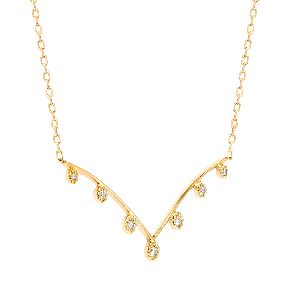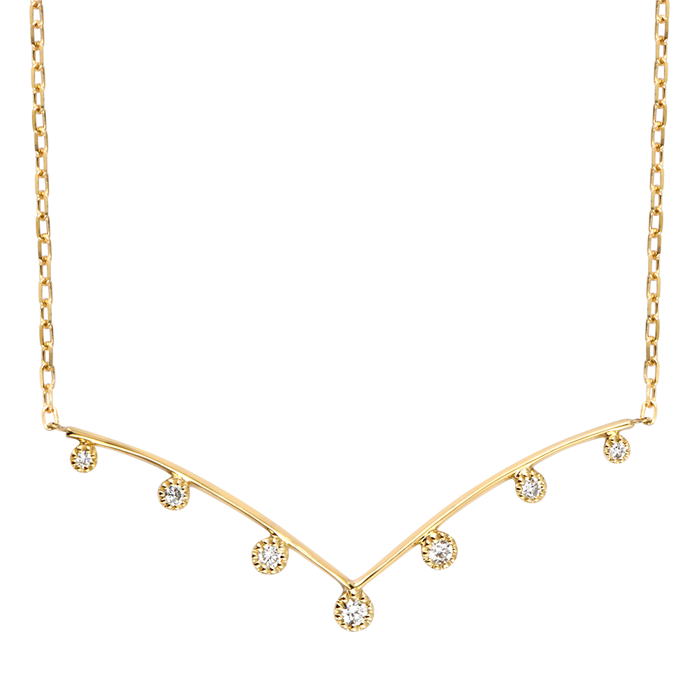 Sette diamanti sospesi con leggerezza su una raffinata curva dorata.Una collana strutturata con delicatezza, tra equilibrio moderno e luminosità discreta.