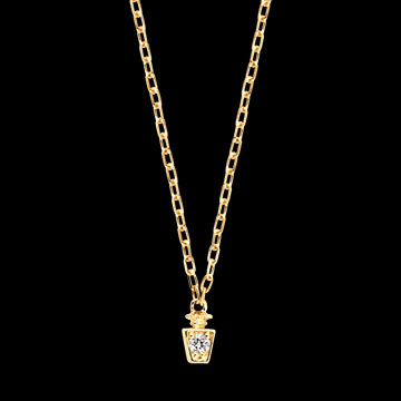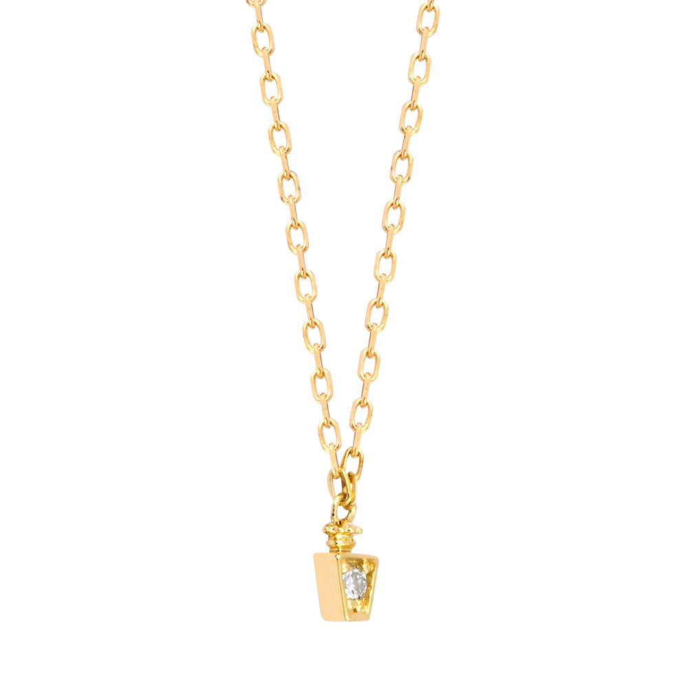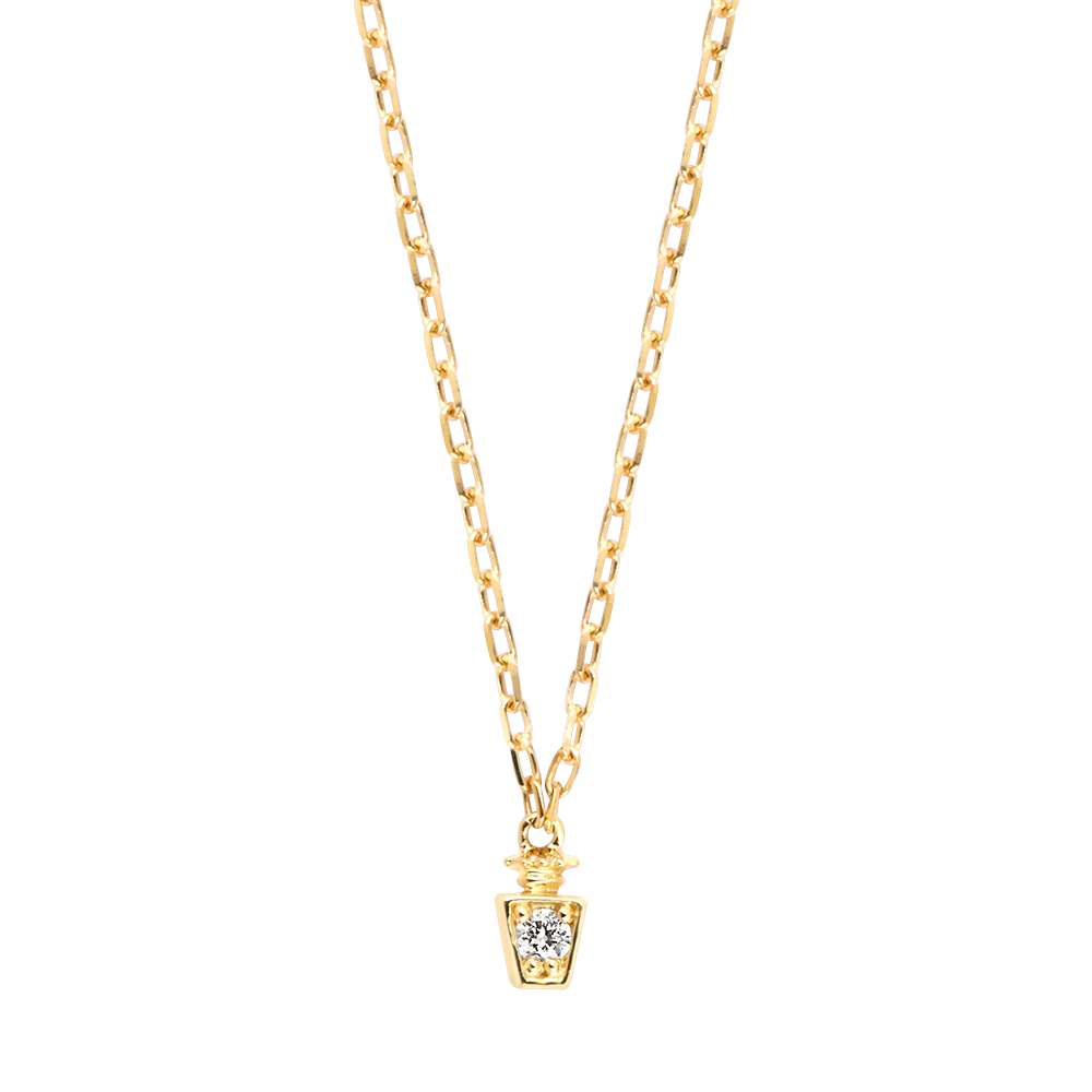 La collana Elixia presenta un pendente a forma di elisir prezioso, realizzato in oro giallo 9 carati. Al centro, un diamante sintetico bianco da 0,03 carati aggiunge un tocco di brillantezza raffinata.