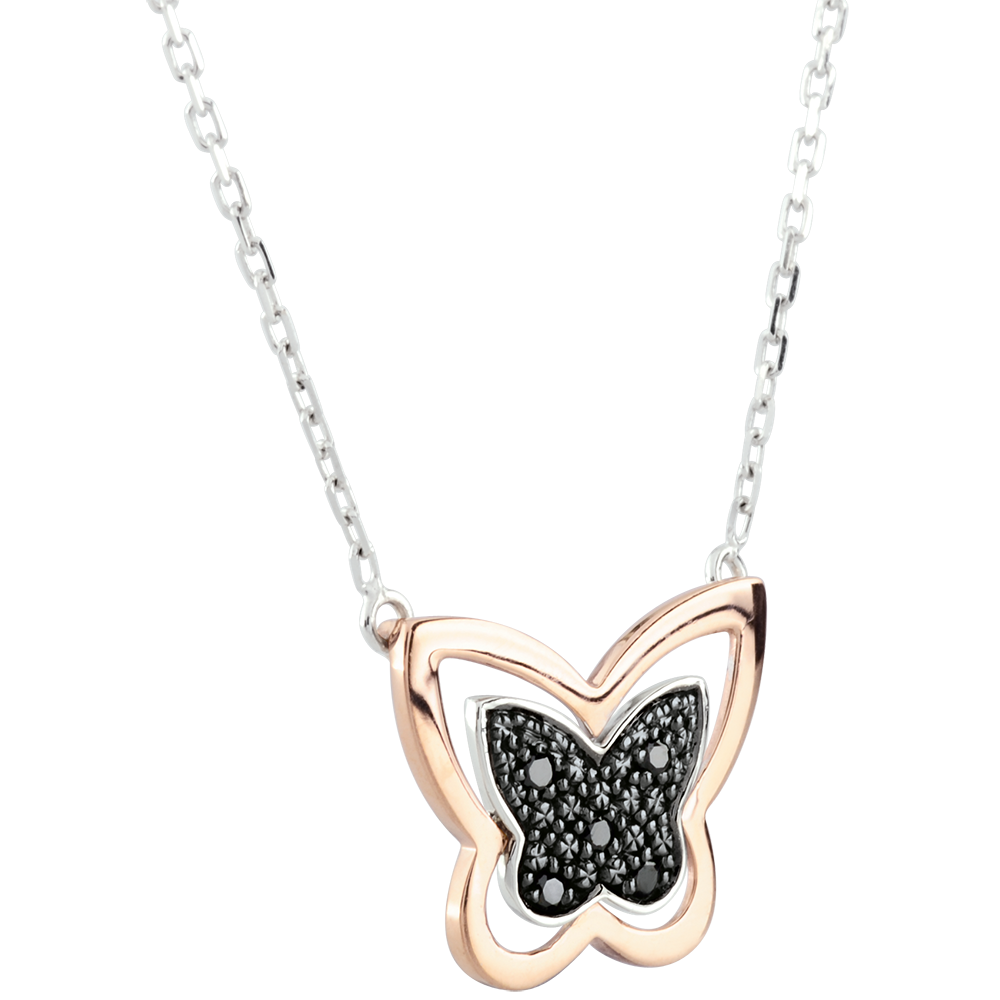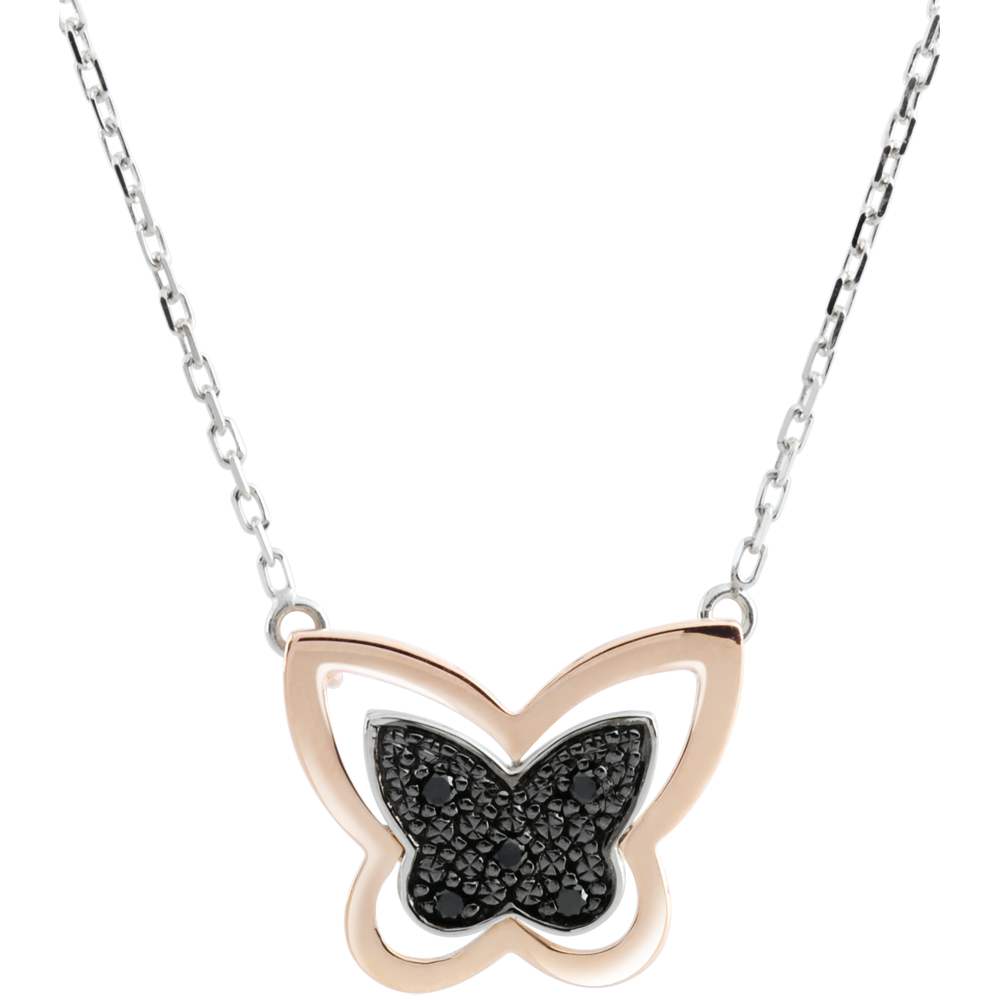 Una particolare farfalla notturna, forgiata nell'Oro rosa e impreziosita da diamanti neri è fissata a una catena in Oro bianco.