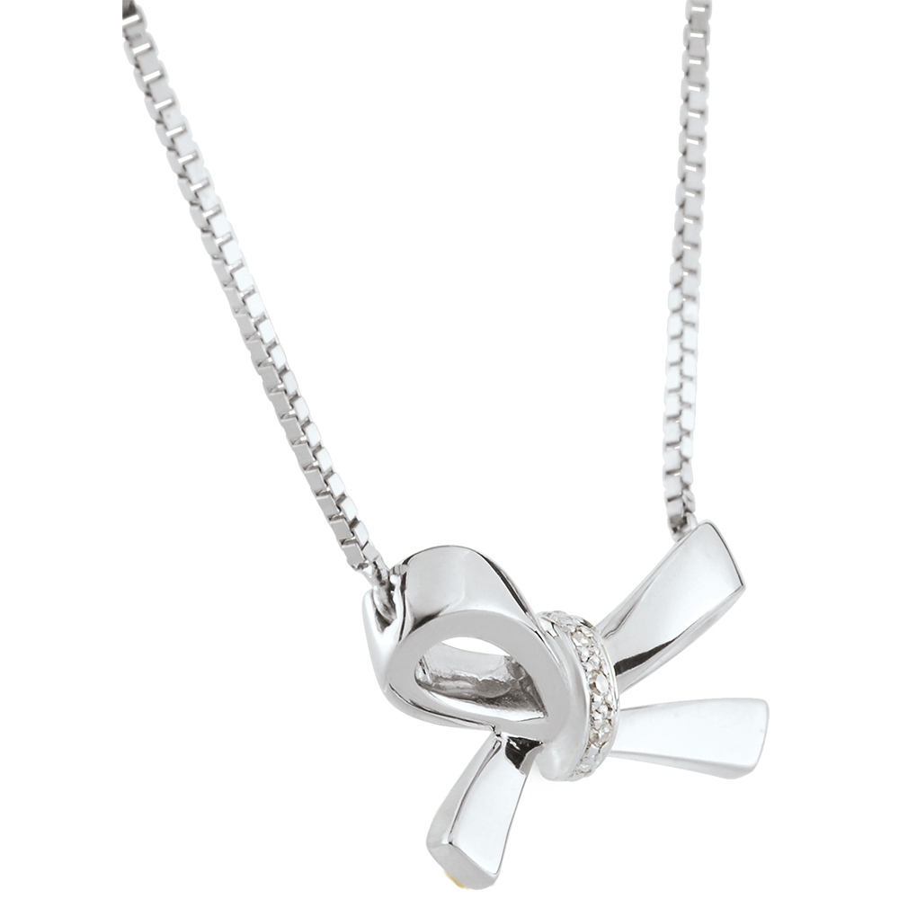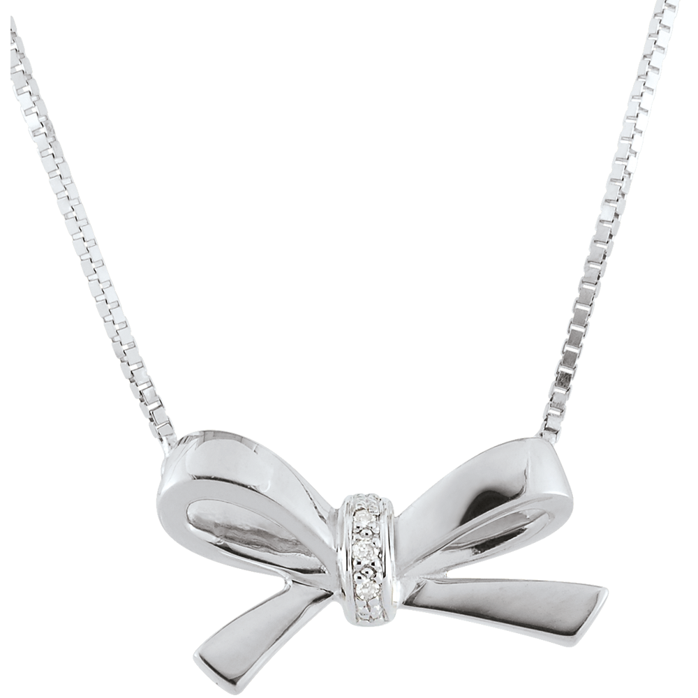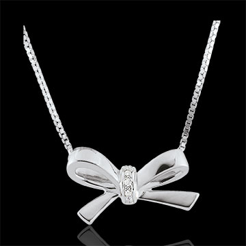 Un delicato piccolo fiocco scintillante e moderno, in Oro bianco e diamanti. Un tocco di femminilità in jeans o in abito da sera.