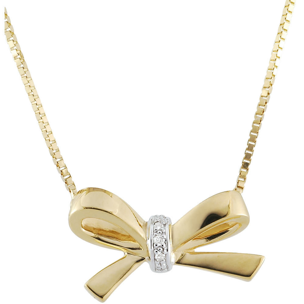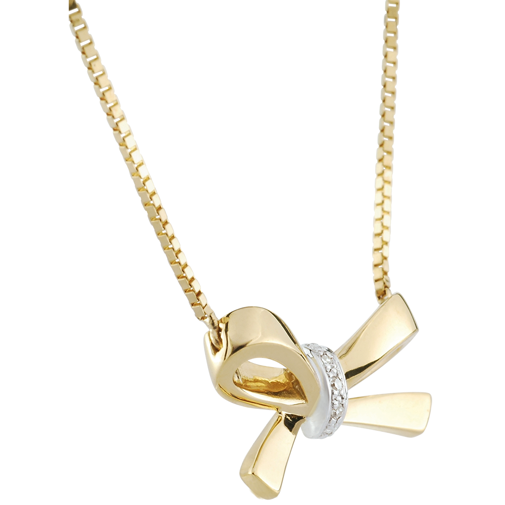 Un delicato piccolo fiocco scintillante e moderno, in Oro giallo e diamanti. Un tocco di femminilità in jeans o in abito da sera.