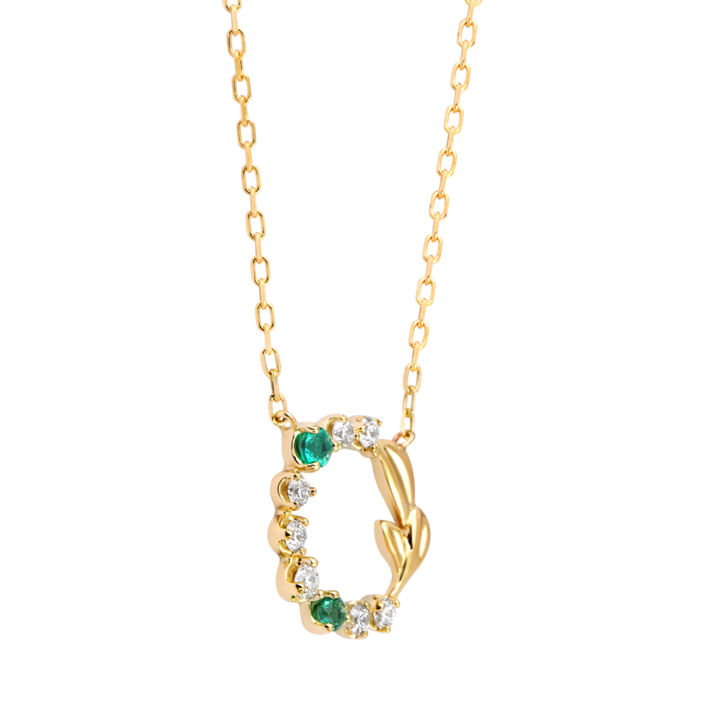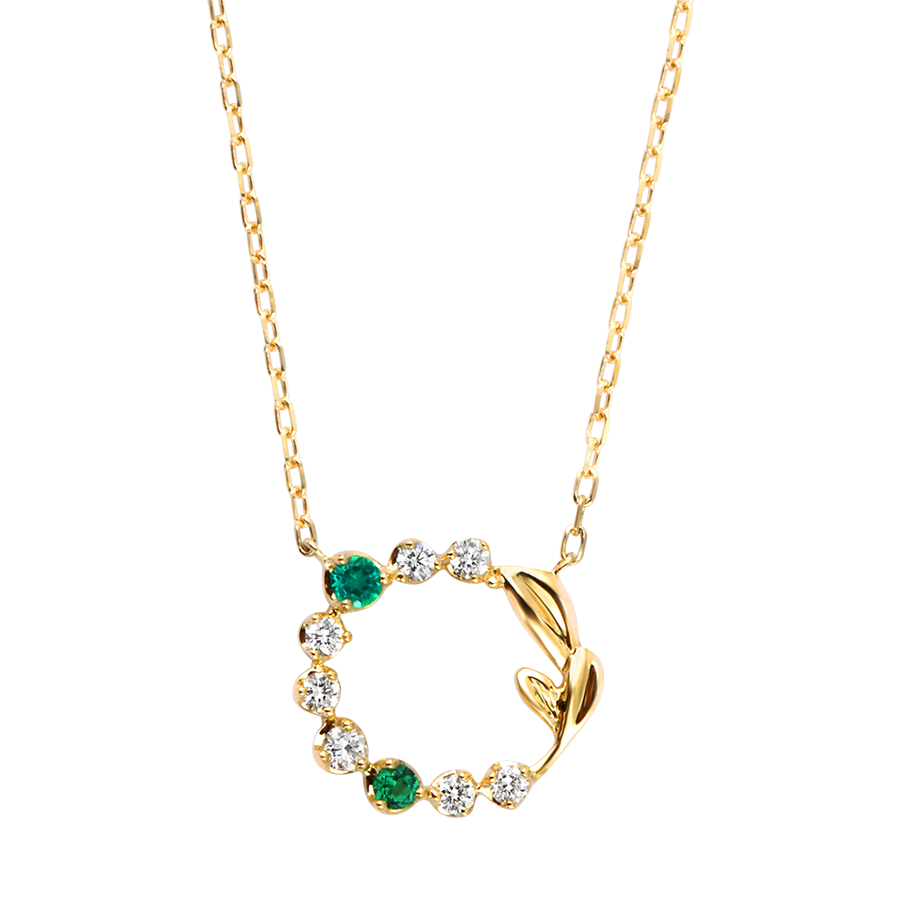 Due smeraldi sintetici luminosi e sette diamanti sintetici formano una delicata corona botanica, impreziosita da un rametto in oro giallo 9 carati. Questo gioiello armonioso celebra lo splendore della natura e l’eleganza senza tempo.