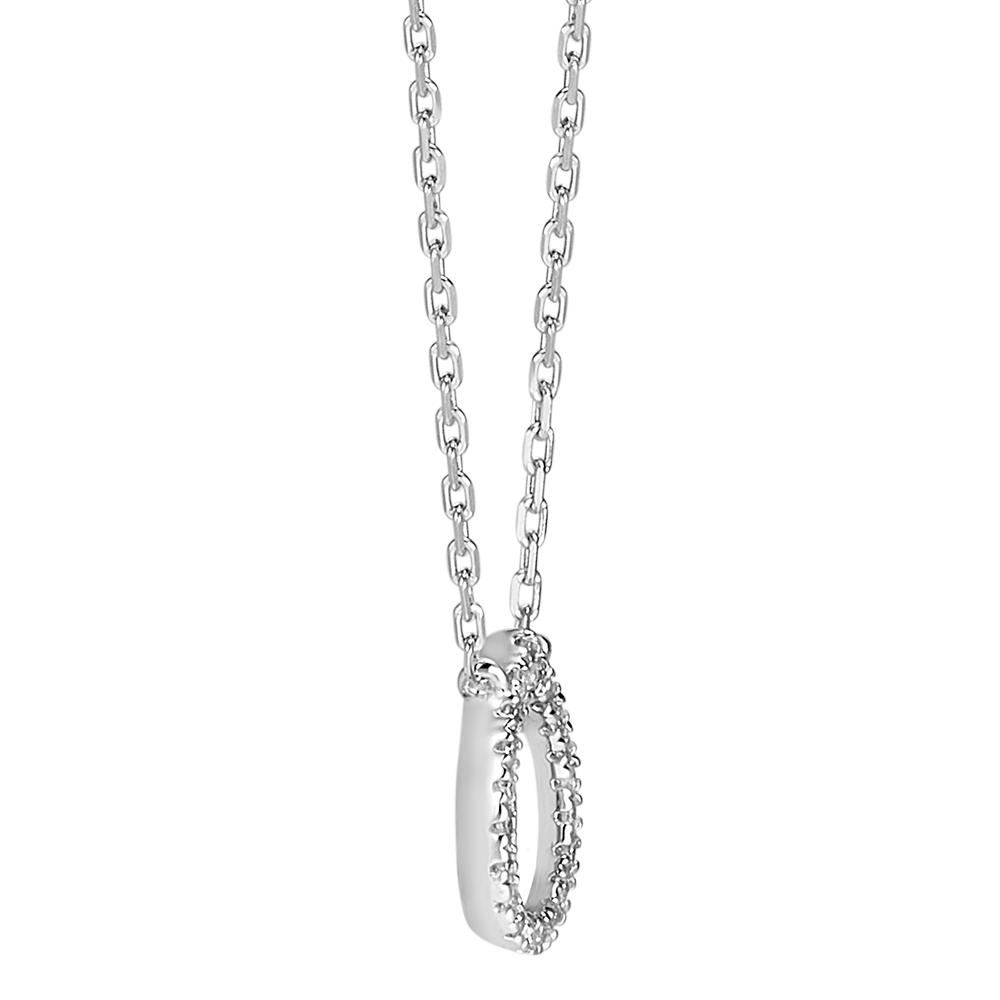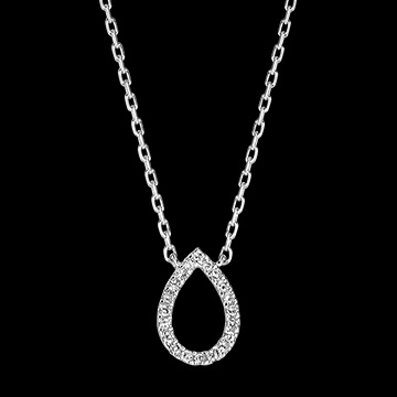 Una goccia impreziosita da un delicato pavé di diamanti e montata su una collana in oro bianco, per un modello puro, vicino alle forme naturali e alle emozioni.