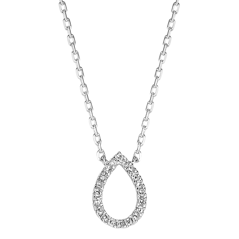 Una goccia impreziosita da un delicato pavé di diamanti e montata su una collana in oro bianco, per un modello puro, vicino alle forme naturali e alle emozioni.