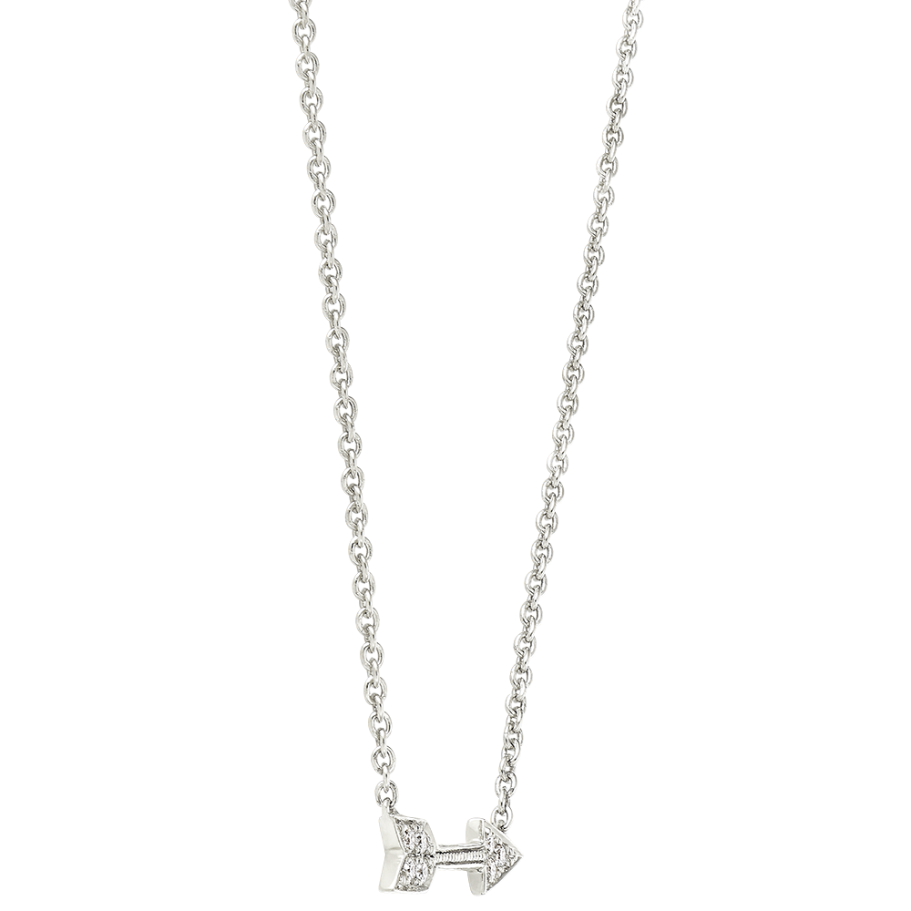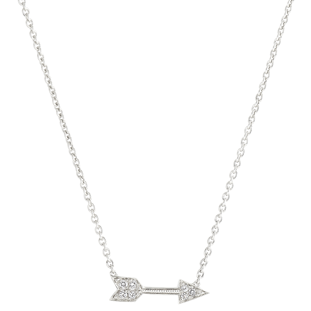 Un collana con motivo di freccia in oro bianco con pavé di diamanti, un gioiello che denota allo stesso tempo un animo romantico e uno spirito rock. Con catenina regolabile a 42cm e 45cm.