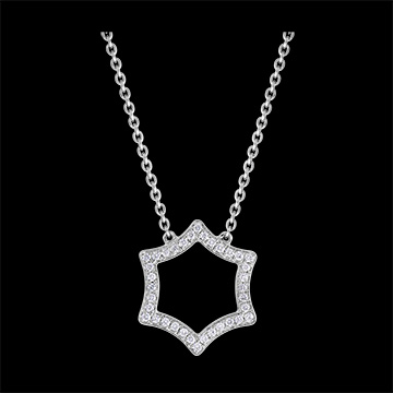 Un collana in oro bianco sottile e femminile, esaltata da un decoro stellato con un delicato pavé di diamanti. Con catenina regolabile a 42cm et 45cm.