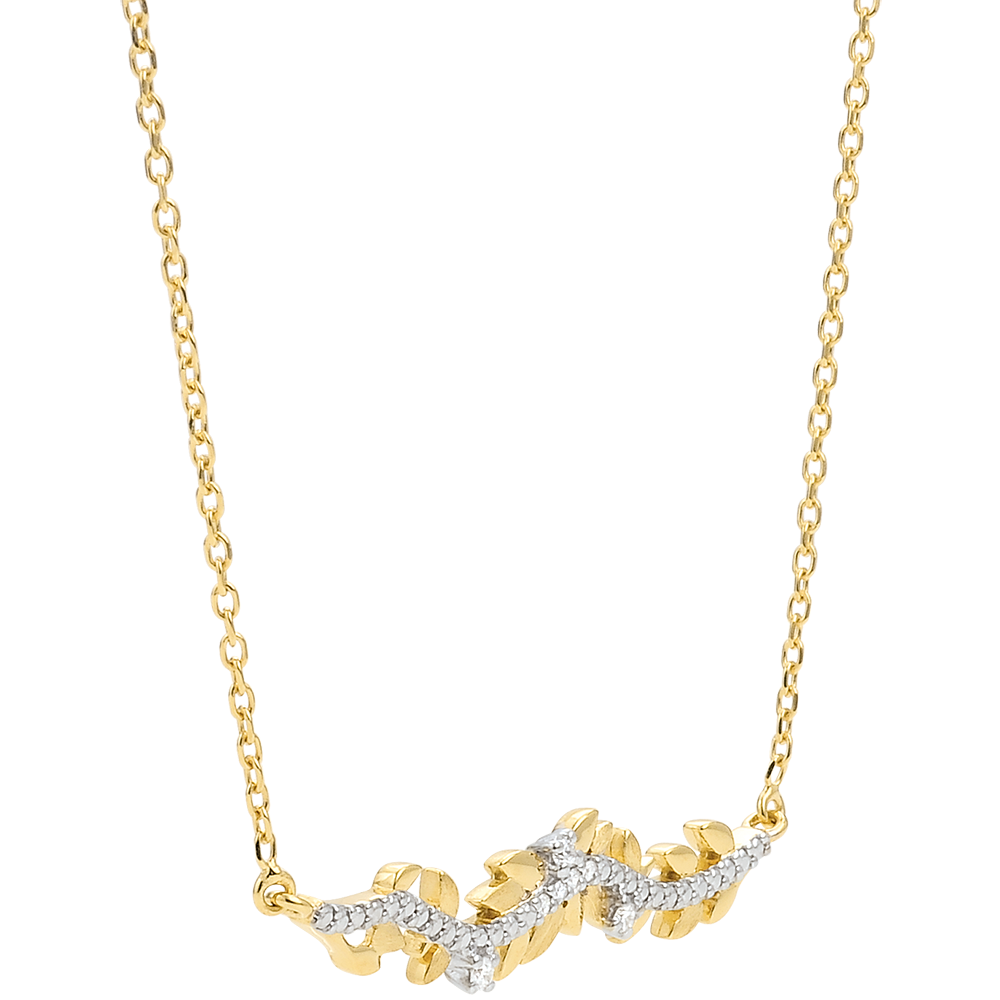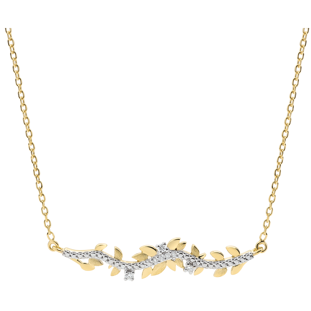 Un'alternanza di foglie brillanti in Oro giallo e di foglie in Oro spazzolato a mano per una collana romantica impreziosita da 7 diamanti.