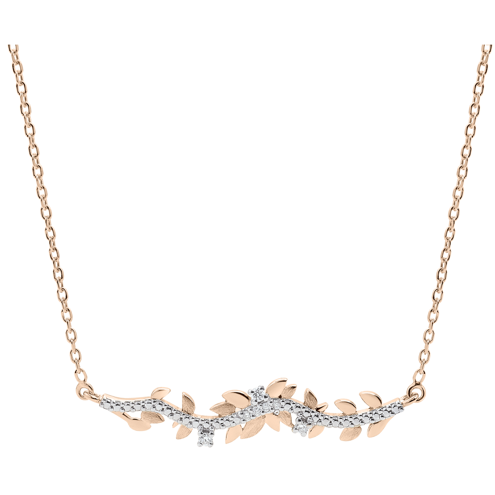 Un'alternanza di foglie brillanti d'oro rosa e di foglie d'oro spazzolato a mano per una collana romantica incastonata di 7 diamanti.