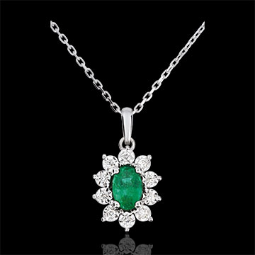Uno smeraldo ovale è il centro di un fiore prezioso in oro bianco dai petali tempestati di diamanti.