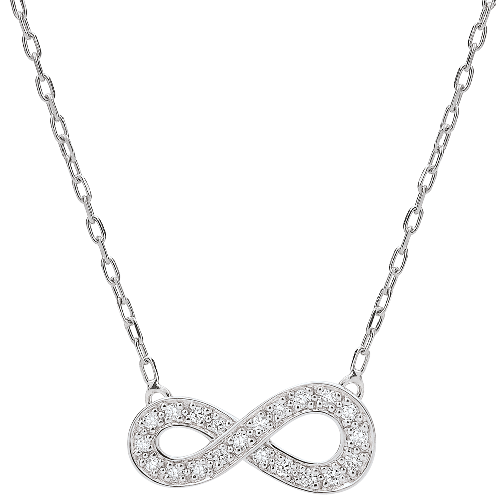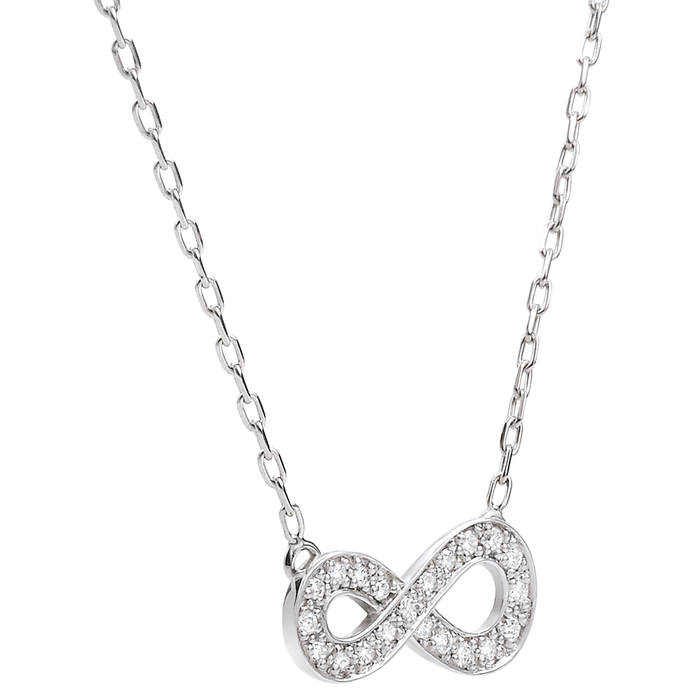 Il segno dell'infinito, simbolo di eternità assoluta, diventa un gioiello in Oro bianco incastonato di diamanti e montato su una collana.