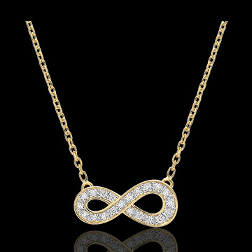 Il segno dell'infinito, simbolo di eternità assoluta, diventa un gioiello in Oro giallo incastonato di diamanti e montato su una collana.