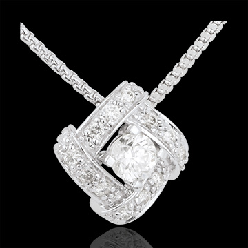 Un diamante solitario è avvolto da un nido d'Oro bianco con pavé di brillanti