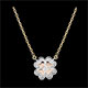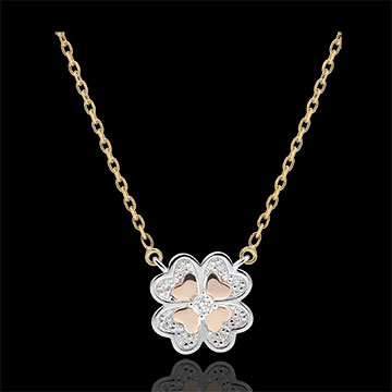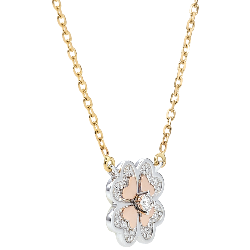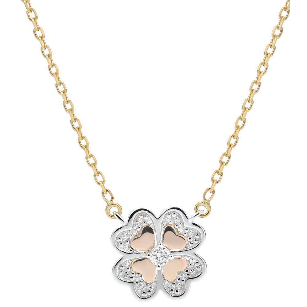 Una collana moderna con un quadrifoglio scintillante in oro bianco, piccoli motivi in oro sulle foglie e un diamante centrale.