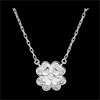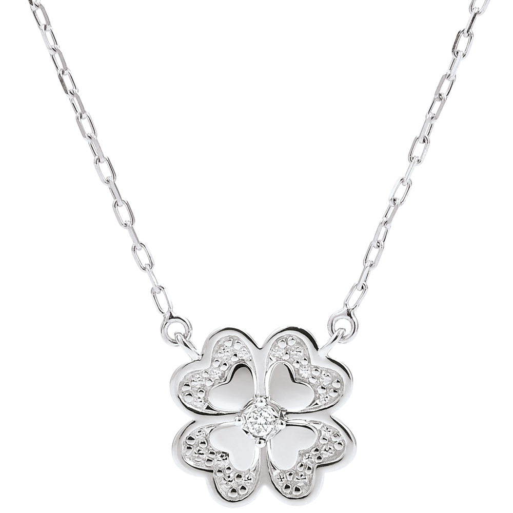 Una collana moderna con un quadrifoglio scintillante in oro bianco, piccoli motivi in oro sulle foglie e un diamante centrale.