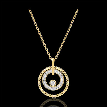 Un cerchio di perle d'Oro giallo circonda un cerchio di diamanti con un solitario al centro.
