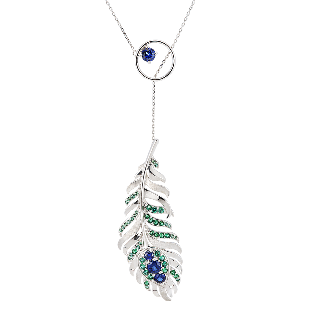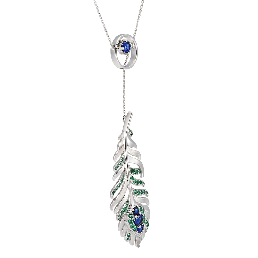 La collana Sautoir, in oro bianco 9 carati, é adornata con 50 smeraldi e zaffiri sintetici che esaltano il suo ciondolo a forma di piuma. La sua catena di 45 cm e il suo design sofisticato conferiscono un aspetto maestoso che riflette perfettamente lo spirito raffinato della collezione Panache.