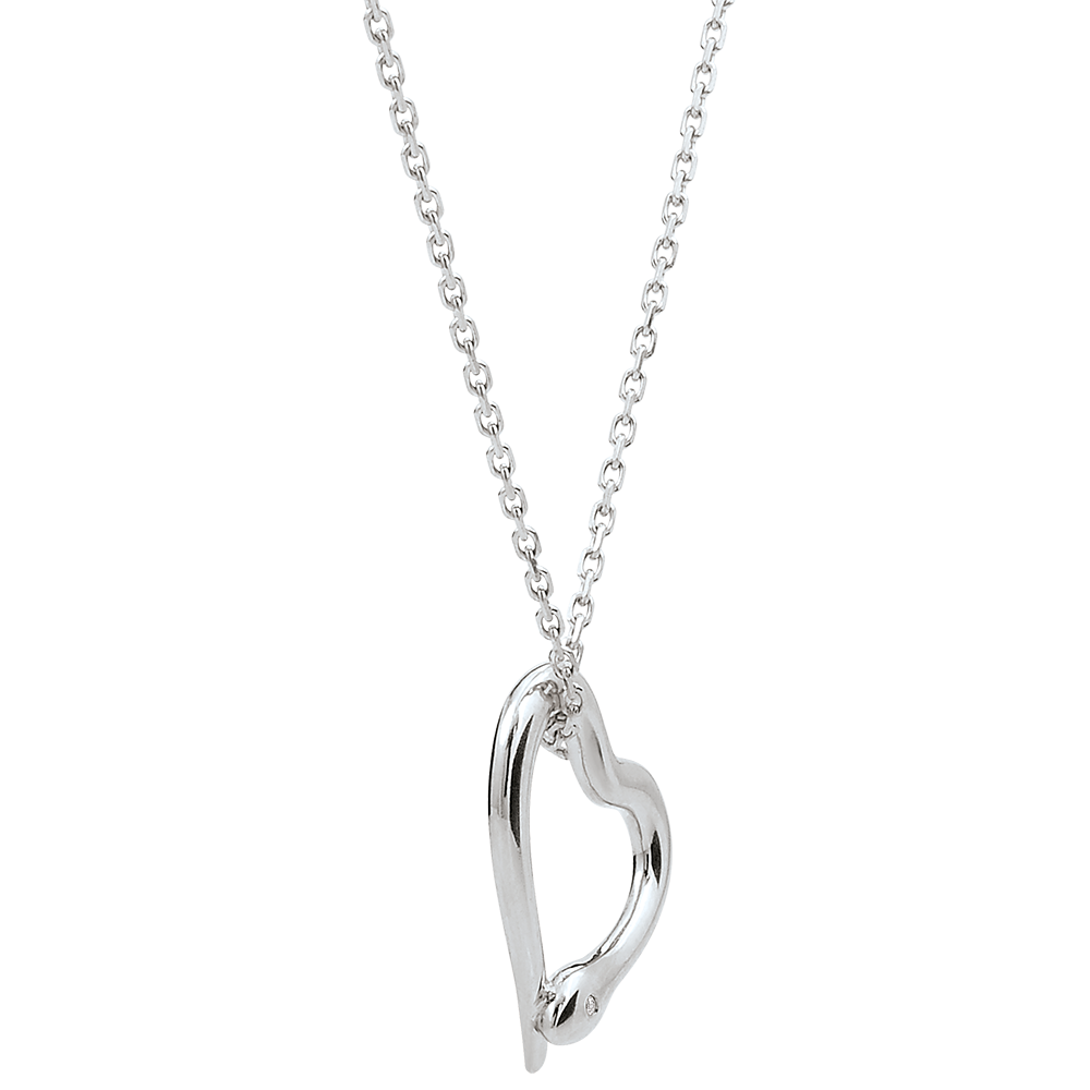 Un serpente in oro bianco si avvolge attorno a una catena sottile e femminile fino a formare un cuore.