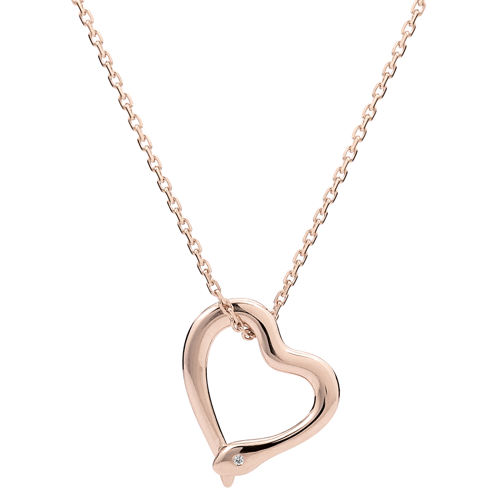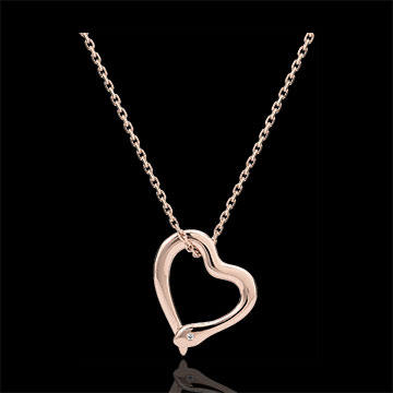 Un serpente in oro rosa si avvolge attorno a una catena sottile e femminile fino a formare un cuore.
