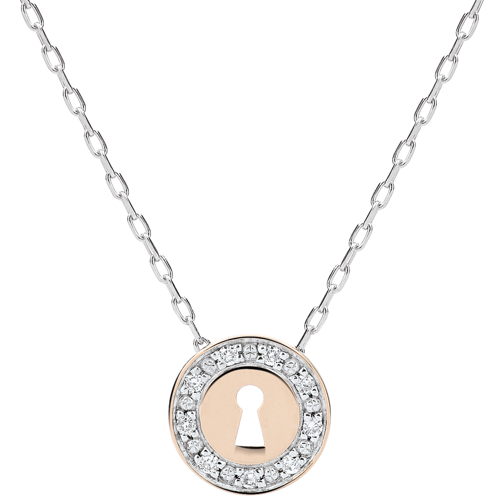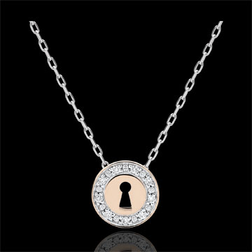 Una collana in Oro rosa decorata da una piccola serratura è montata su una catena in Oro bianco impreziosita da due brillanti.