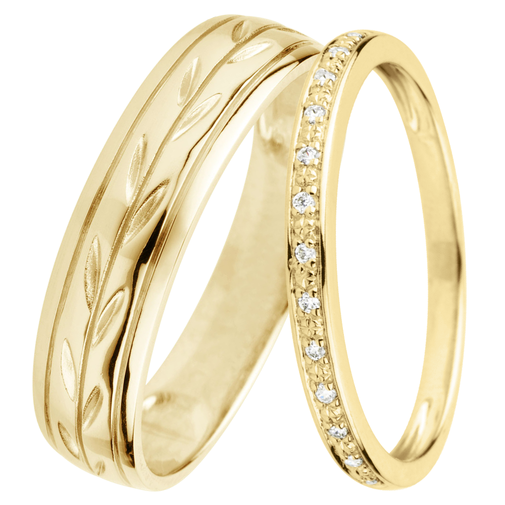Una raffinata coppia di fedi nuziali per lei & lui. Un'anello mezzo giro con diamanti incastonati per lei, e una fede larga in oro giallo incisa con fogliame eterno per lui.…