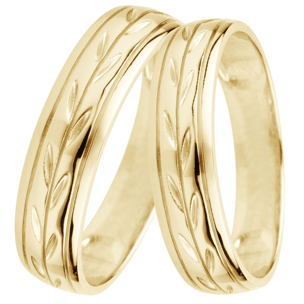 Una larga fede nuziale in Oro giallo con eleganti incisioni a motivo di foglia.