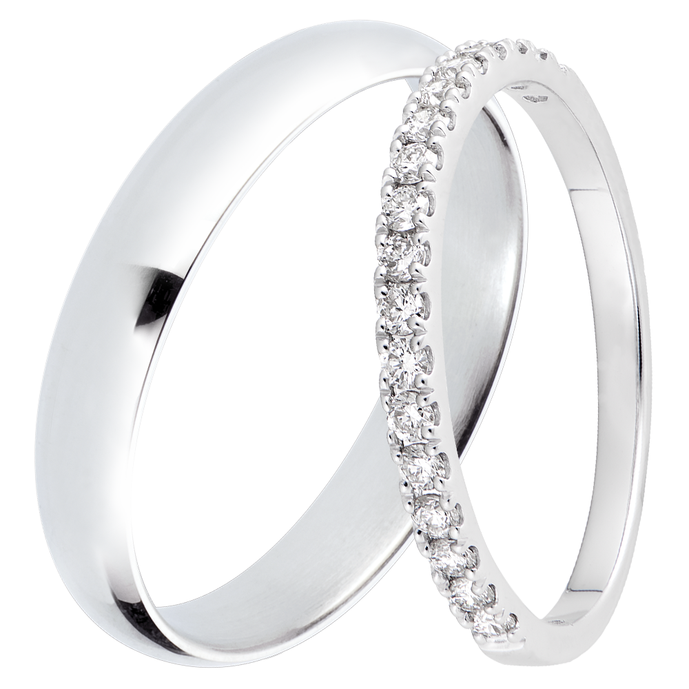 Un elegante duo di fedi per lei & lui. Per lei, una fede semi pavé con 18 diamanti per un totale di 0,26 carati. Per lui, un anello in oro bianco lucido da 4 mm.…