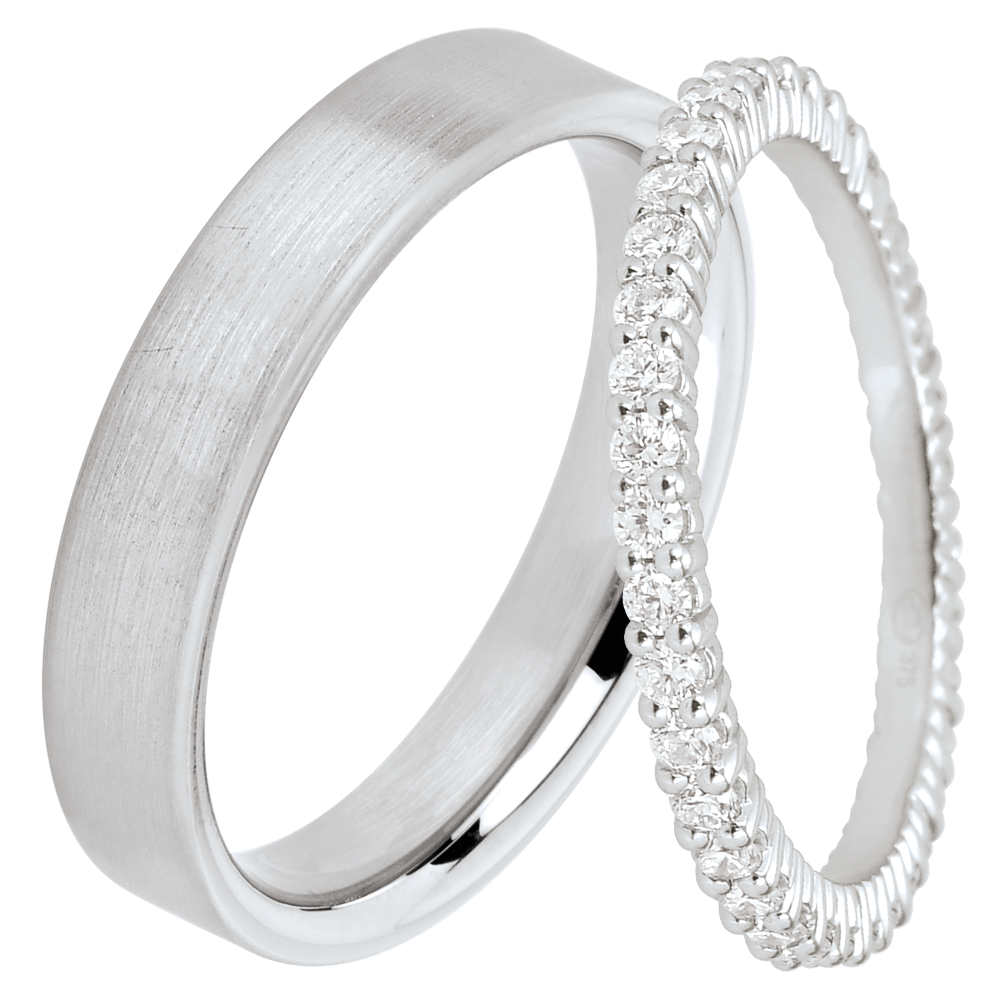 Una coppia di fedi elegante per lei e lui. Per lei: un giro completo con 38 diamanti da 0,57 carati totali, montati a griffes. Per lui: una fede nuziale in oro bianco satinato, larga 4 mm. Raffinatezza per un amore senza tempo.