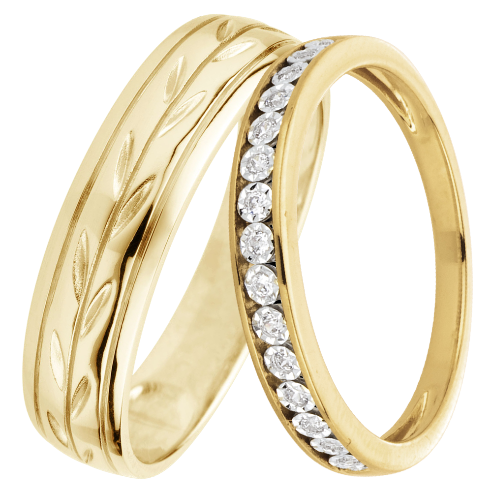 Un’elegante coppia di fedi per lei & lui. Per lei: una fede in oro giallo impreziosita da diamanti su montatura in oro bianco. Per lui: una fede larga in oro giallo incisa con foglie eterne.…