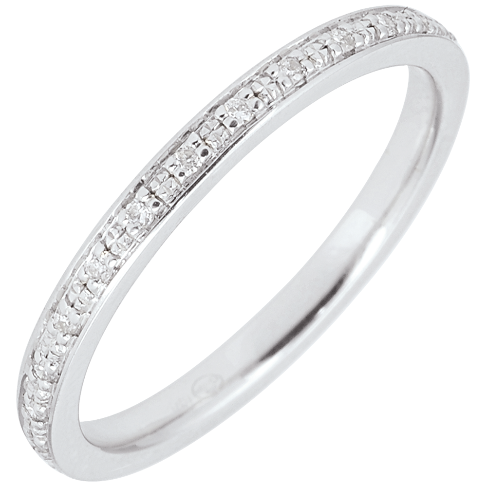 Questa esclusiva fede in Oro bianco è impreziosita su tutta la circonferenza da meravigliosi diamanti. Una fede nuziale dall'eleganza senza tempo, ideale da indossarsi sola o abbinata all'anello di fidanzamento.