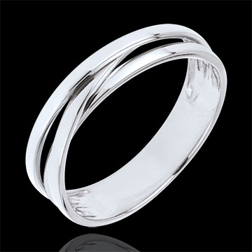 Una trilogia di anelli in Oro bianco uniti in una fede elegante e sinuosa.