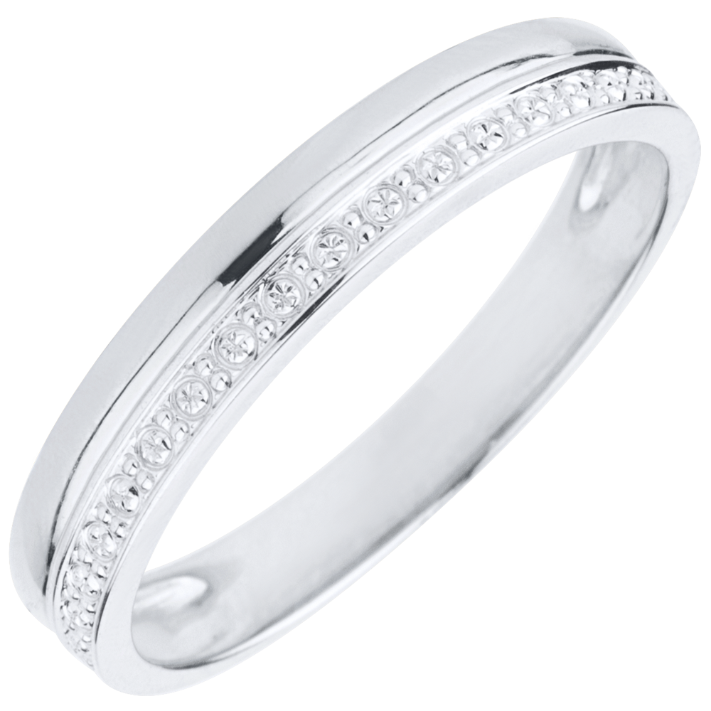 No, è priva di pietre ma presenta una fascia lavorata a effetto diamante per un'eleganza discreta.