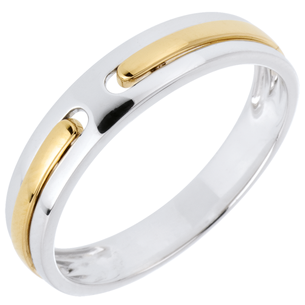 Due linee in oro giallo si uniscono come una promessa d'eternità racchiusa in un anello in oro bianco. Una fede nuziale allo stesso tempo classica e unica. Questa fede per uomo in oro bianco e in oro giallo può essere indossata anche da una donna grazie alla sua larghezza di 4 mm. Una fede nuziale ideale per celebrare il vostro matrimonio o fidanzamento.