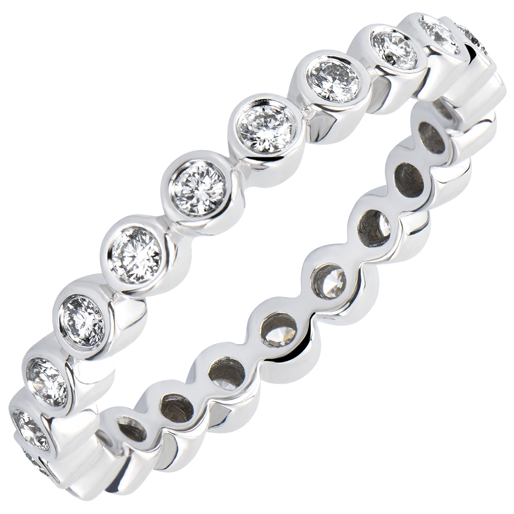 Una fede nuziale perlata da un pavé di 21 diamanti a incastonatura chiusa. Uno scintillio ineguagliabile, ispirato alla luce delicata riflessa dalle gocce di rugiada al mattino.