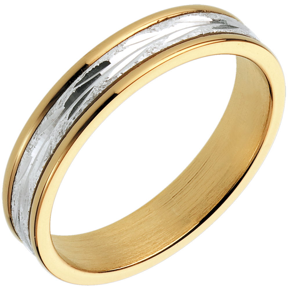 Una fede in Oro giallo sobria e originale, sottolineata da un archetto centrale in Oro bianco con inciso un motivo di foglie.