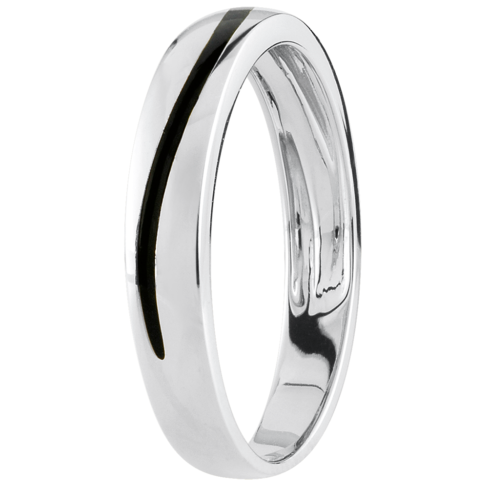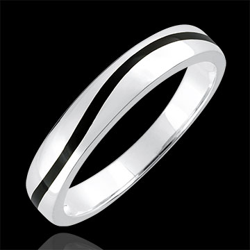 Un anello bombato in Oro bianco attraversato da un'onda in lacca nera per una fede moderna e maschile.