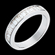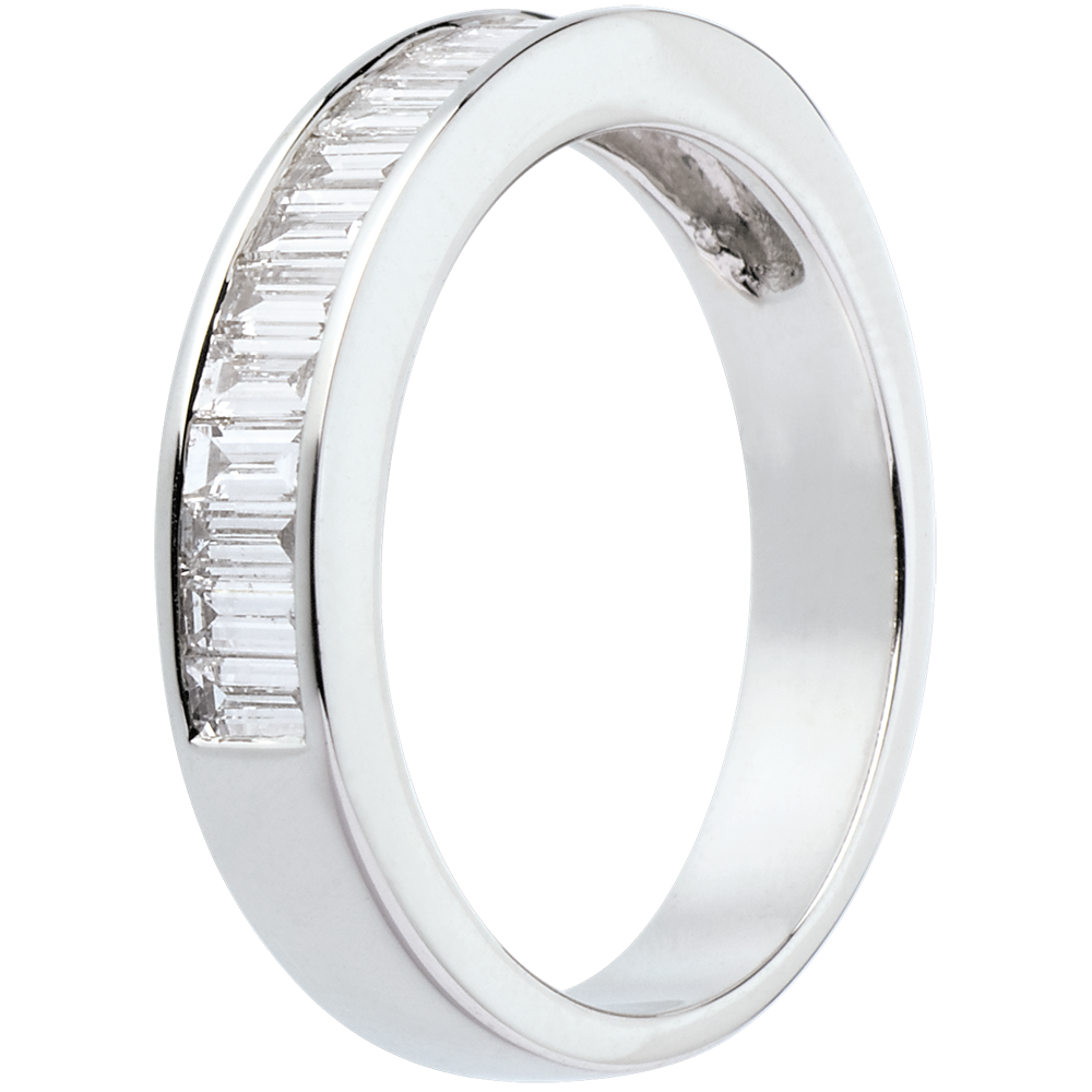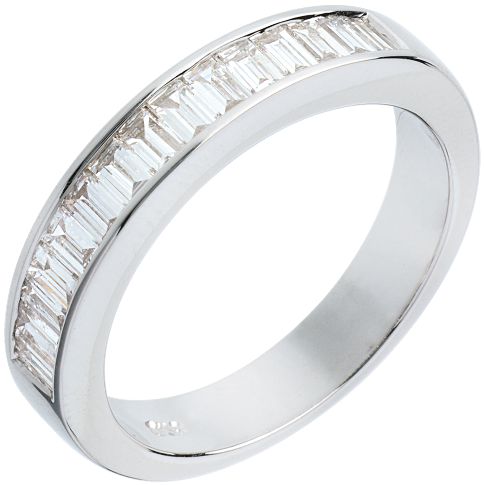 Un anello a sezione quadrata con pavé semi circolare, dal design semplice e raffinato. Diamanti taglio baguette incastonati a binario.