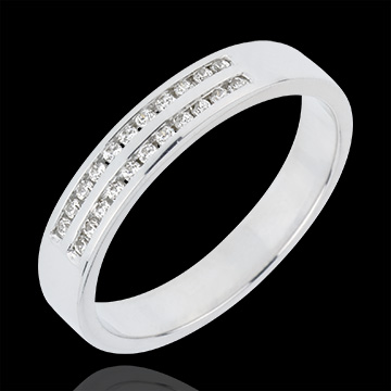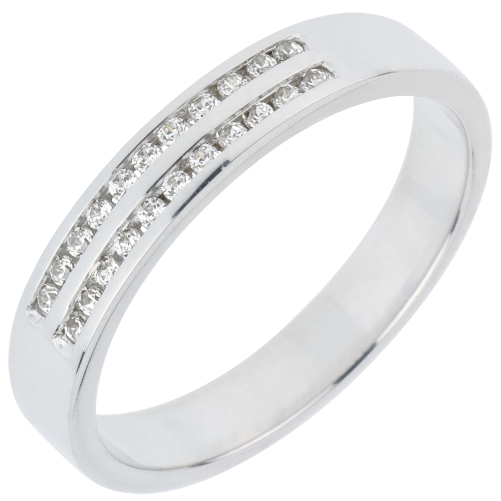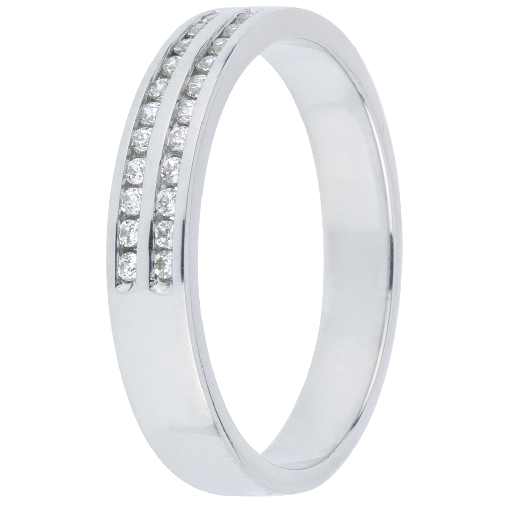 Il perfetto equilibrio di un anello a due file di diamanti incastonati a binario. Un gioiello indispensabile per un legame speciale