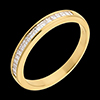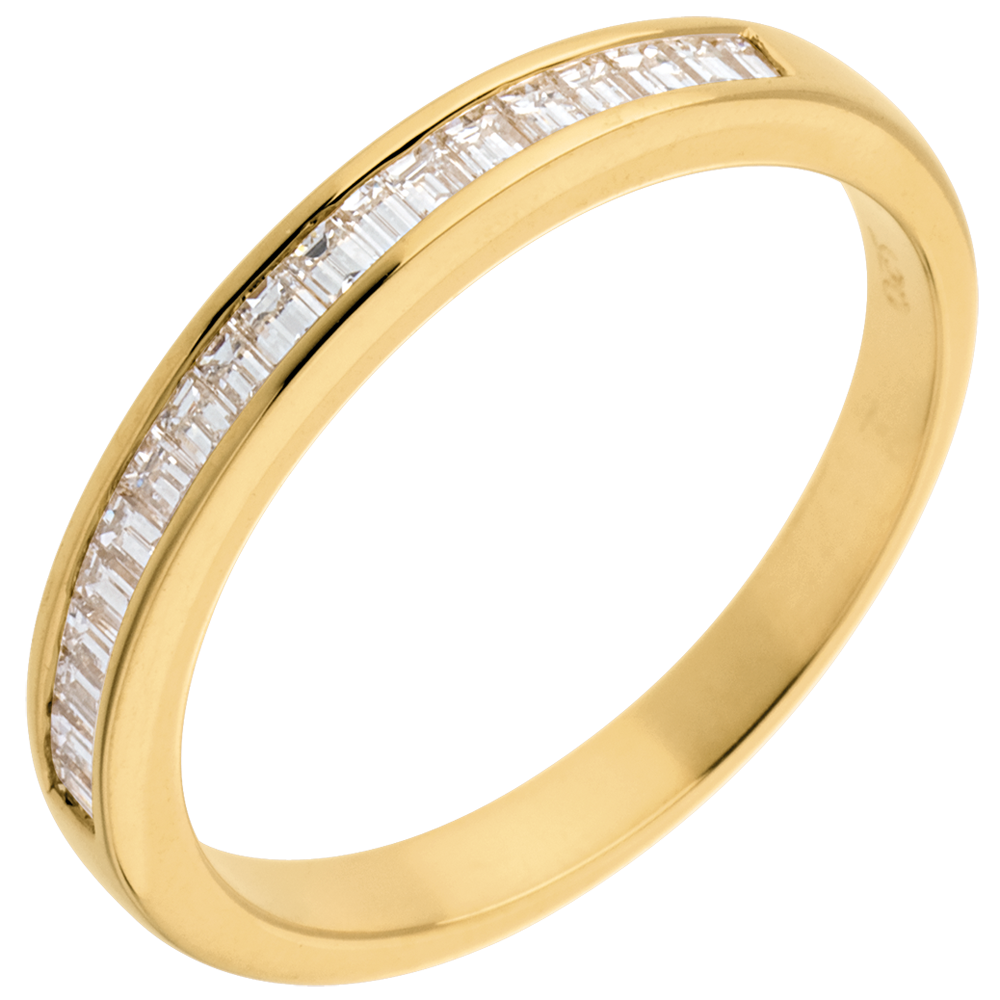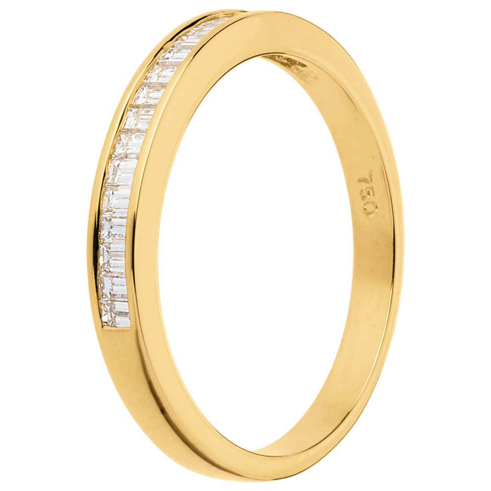 Un anello a sezione quadrata e lastricazione semi circolare, dal design semplice e raffinato. Diamanti incastonati a binario taglio baguette.