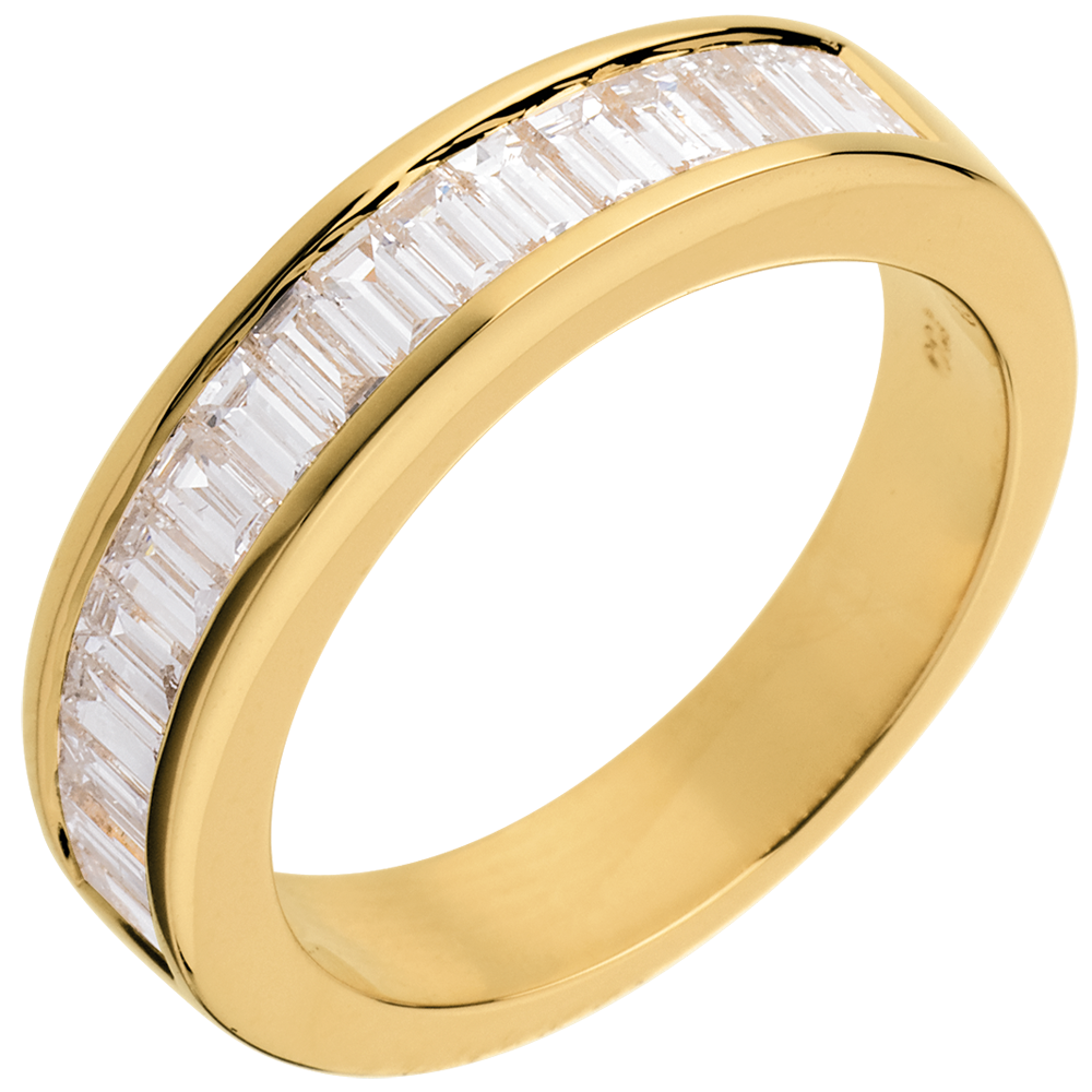 Un anello a sezione quadrata con pavé semi circolare, dal design semplice e raffinato. Diamanti taglio baguette incastonati a binario.