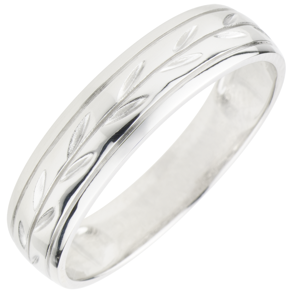 Una larga fede in Oro bianco con un motivo inciso di foglie delicate.