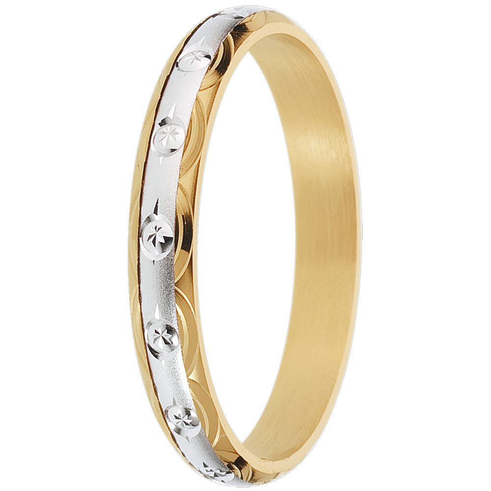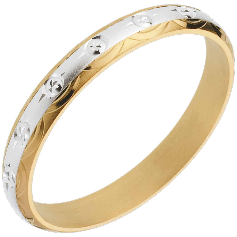 Una fede originale che unisce Oro bianco e giallo, finamente incisa di simboli per attirare l'energia del sole.