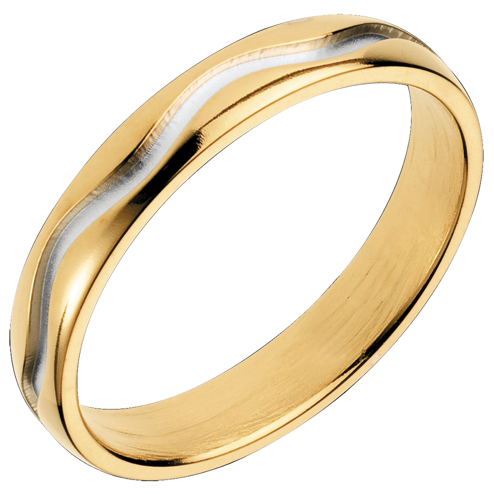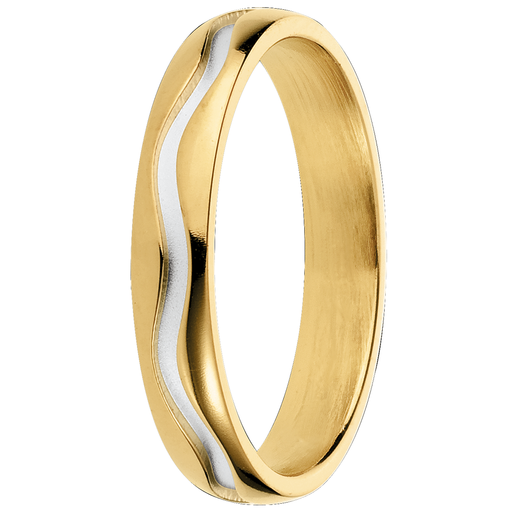 Un anello in Oro giallo solcato da un un linea sinuosa in Oro bianco.