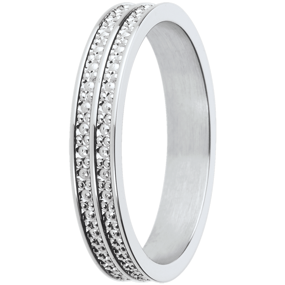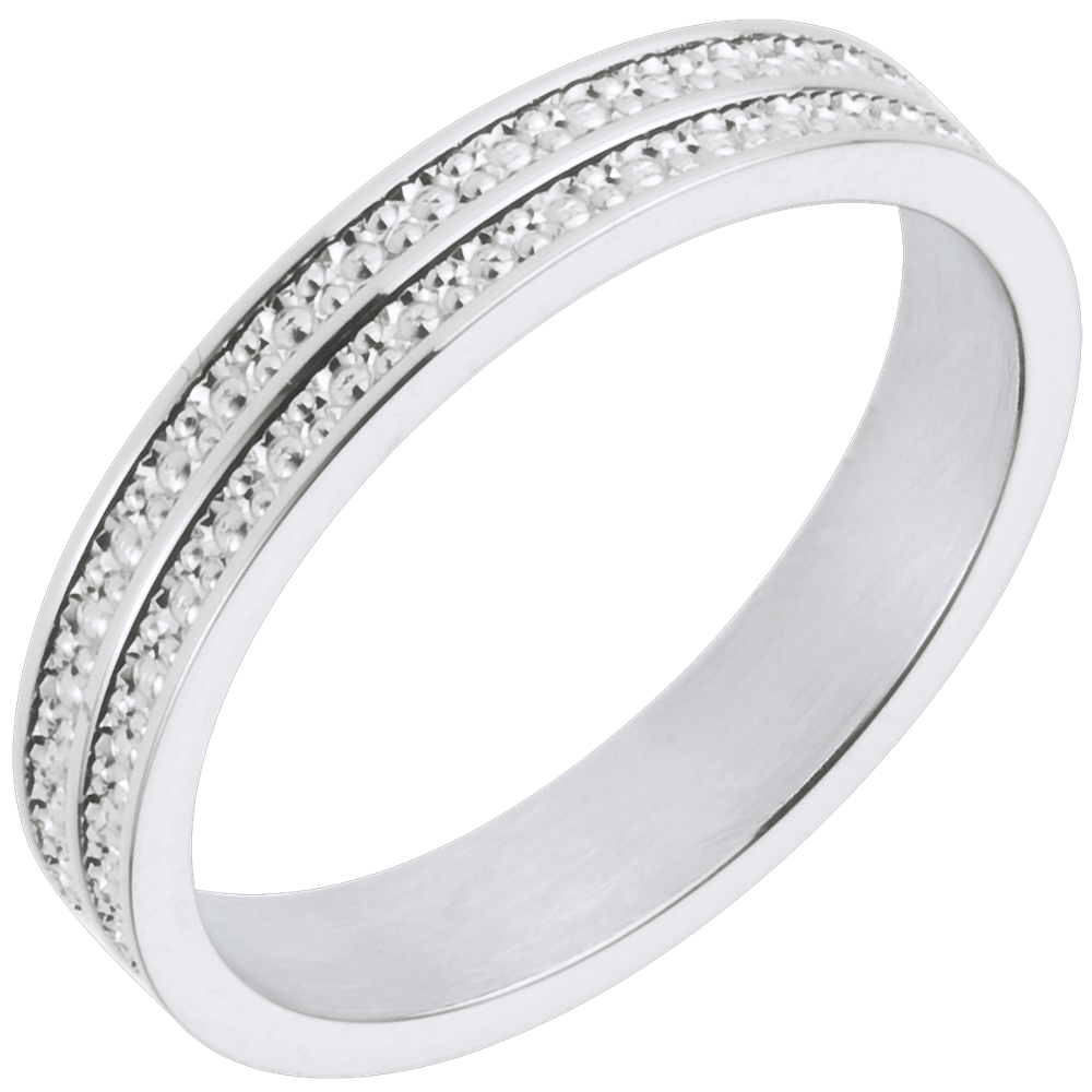 Una fede nuziale attraversata da una doppia linea lavorata a diamante, come simbolo di due vite che scorrono insieme.