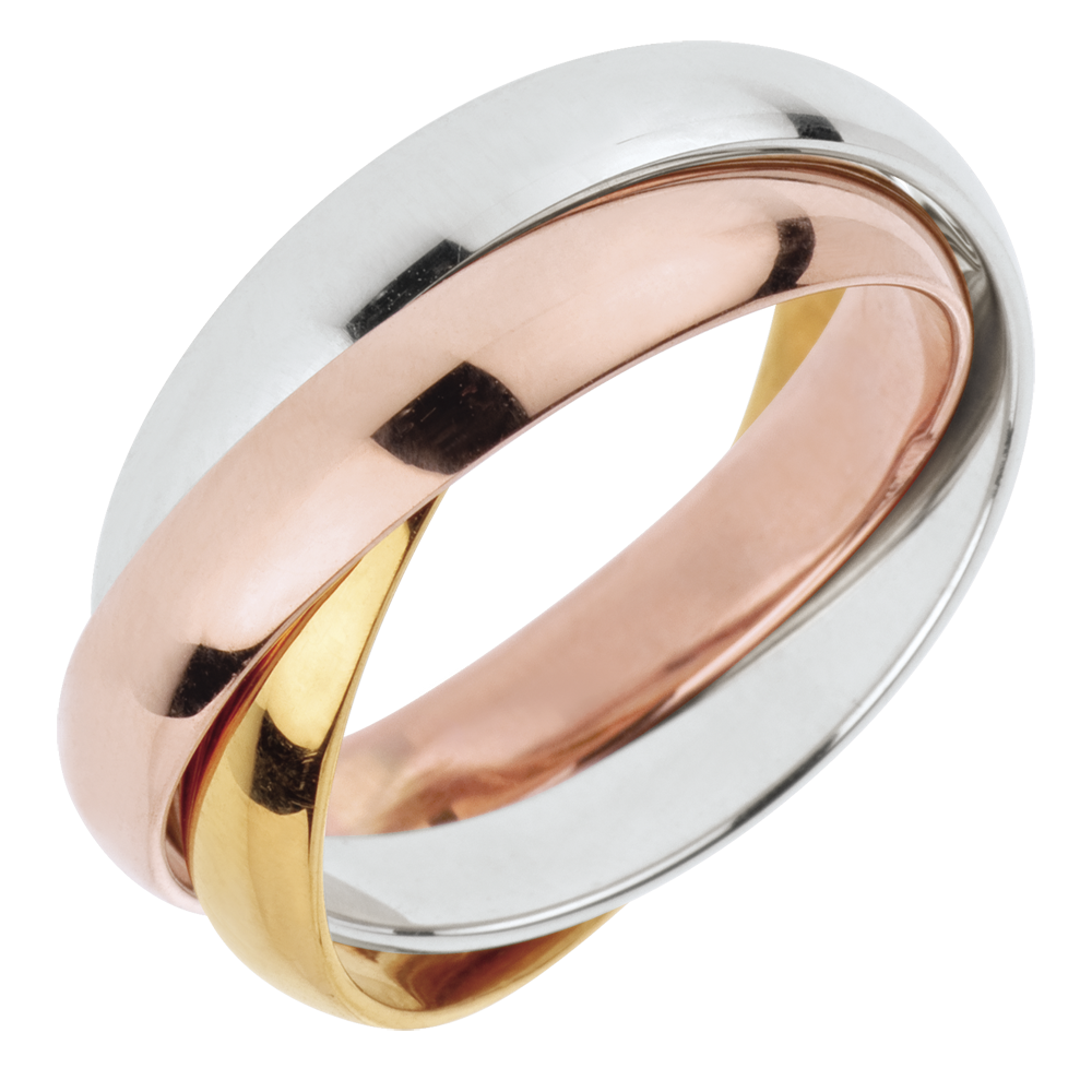 Un anello in Oro giallo, uno in Oro bianco e un terzo in Oro rosa sono uniti per l'eternità.