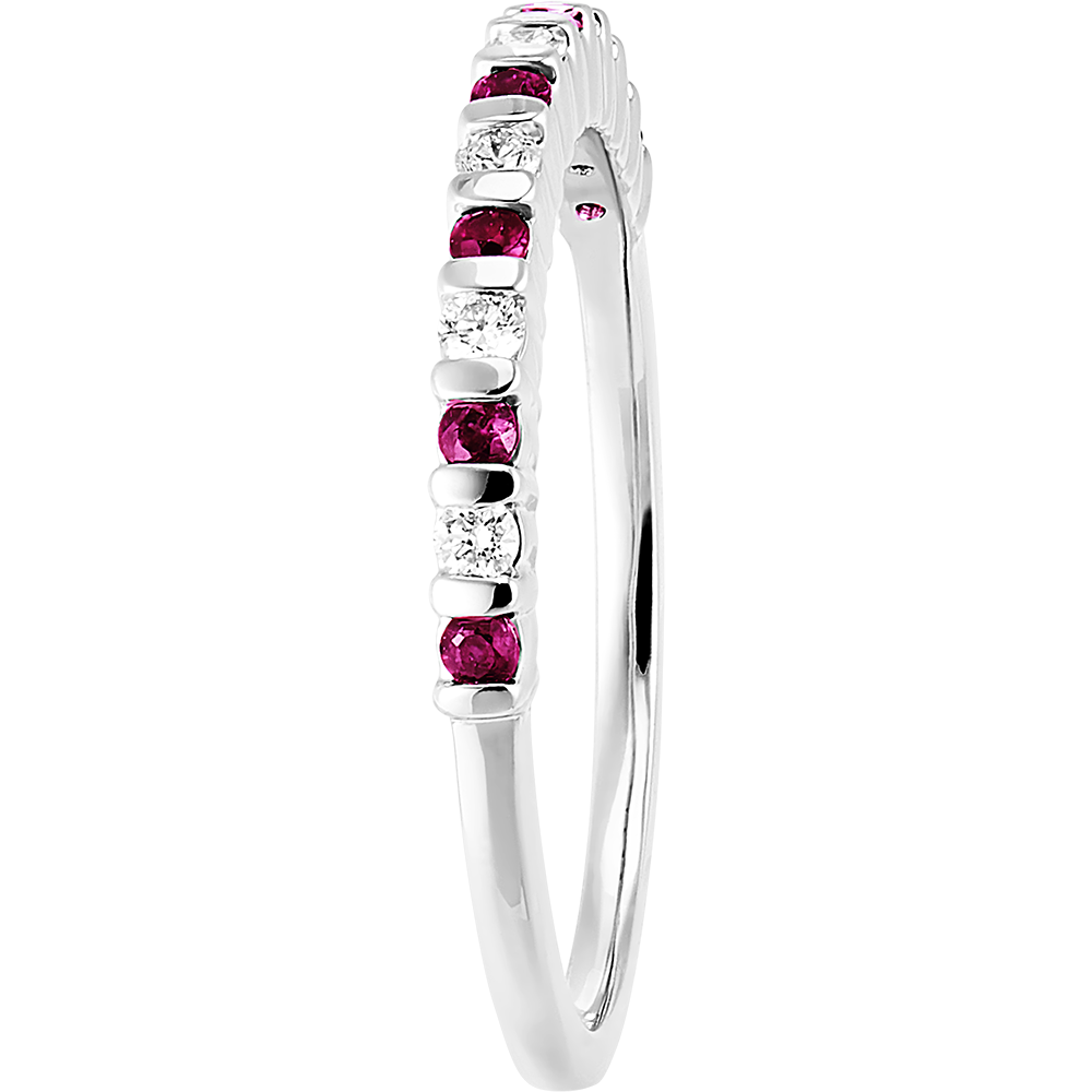 Un anello in oro bianco impreziosito da rubini e diamanti alternati. Un gioiello classico e senza tempo, con un tocco di colore.