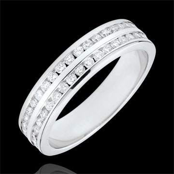 L'equilibrio perfetto di un anello in oro bianco con due file di diamanti rotondi incastonati a rotaia per un simbolismo forte. Un gioiello indispensabile per un legame d'eccezione.